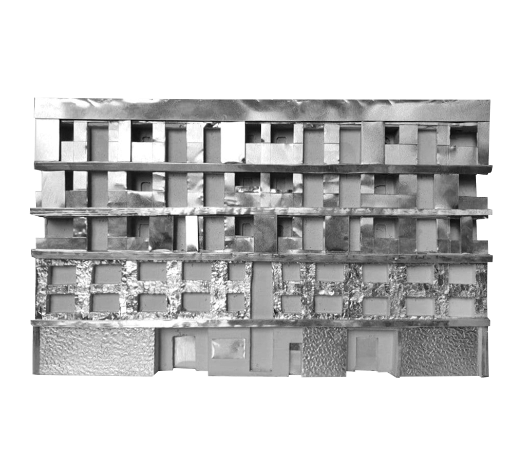 Фасад подчёркнуто слоист, распадается на горизонтальные полосы и одновременно расслаивается в вертикальной плоскости. Он облицован отражающими металлическими панелями, которые могут сдвигаться, защищая жителей дома от шума и огней города.