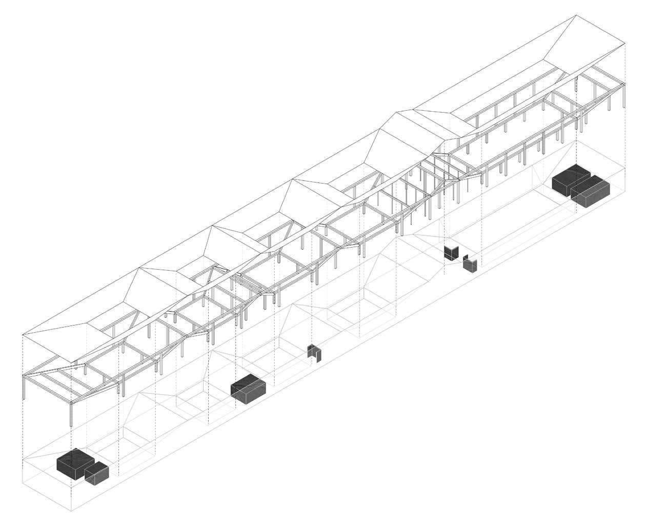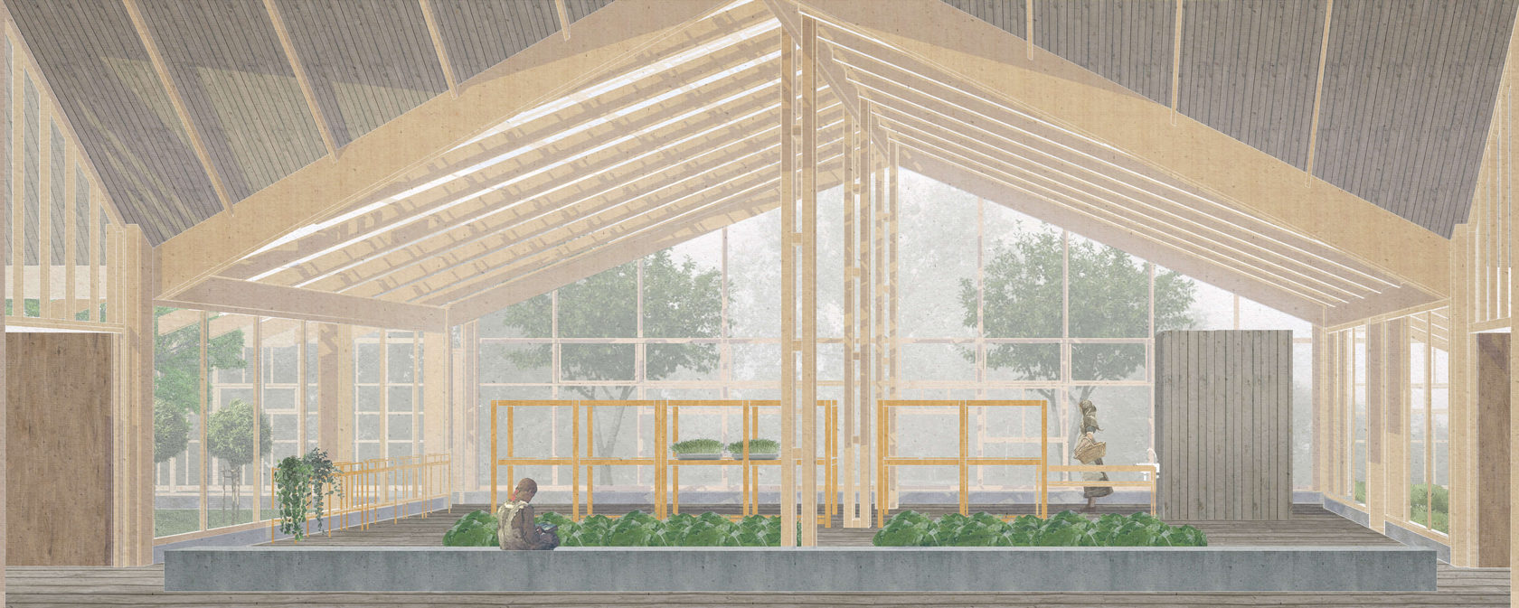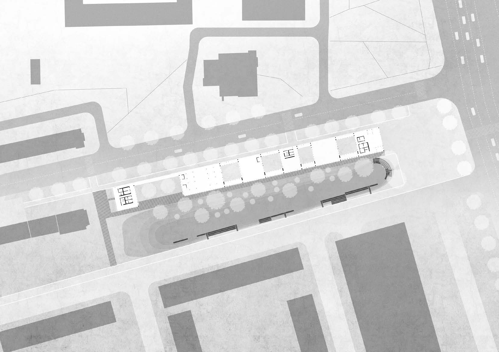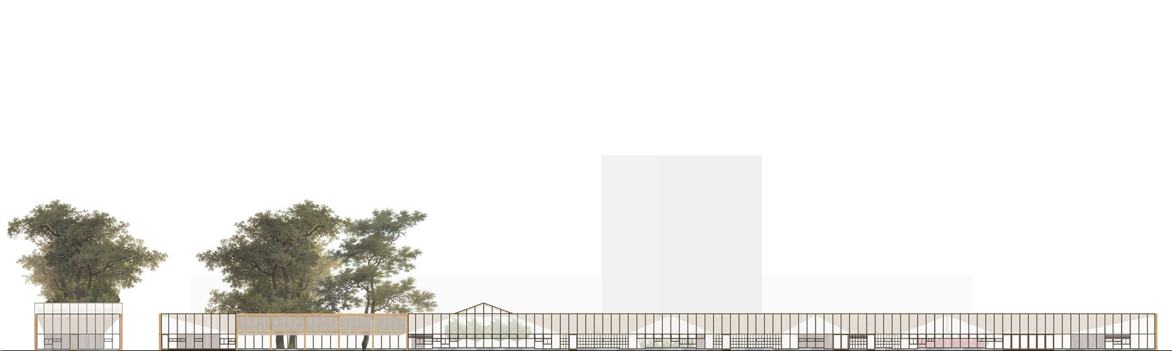 Новое строение вытянуто вдоль улицы и оставляет с противоположной стороны открытую прогулочную зону с ярко выраженным рельефом ― амфитеатр. Пространства общественного сада организованы анфиладой, где каждое внутреннее помещение чередуется с открытым двором или прудом. В сторону открытых дворов направлены скаты остеклённых крыш: эта конструкция локализует собираемую с кровли дождевую воду, которая используется для орошения, и создаёт характерный, запоминающийся силуэт здания.