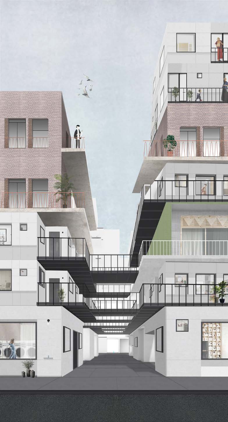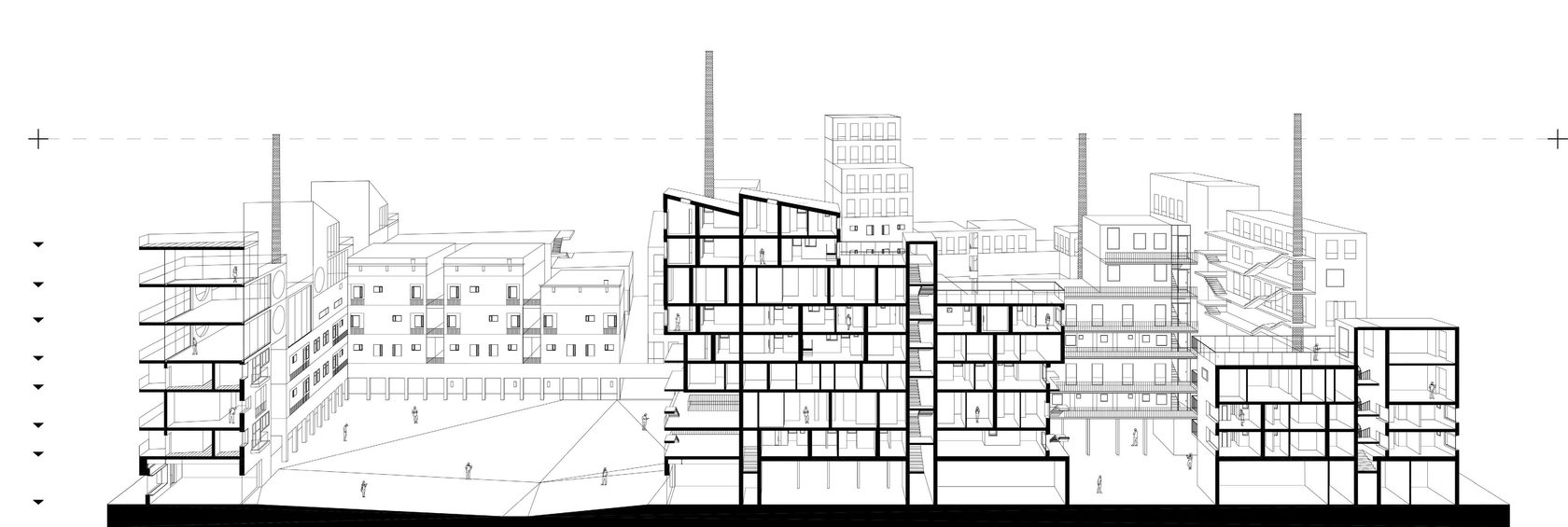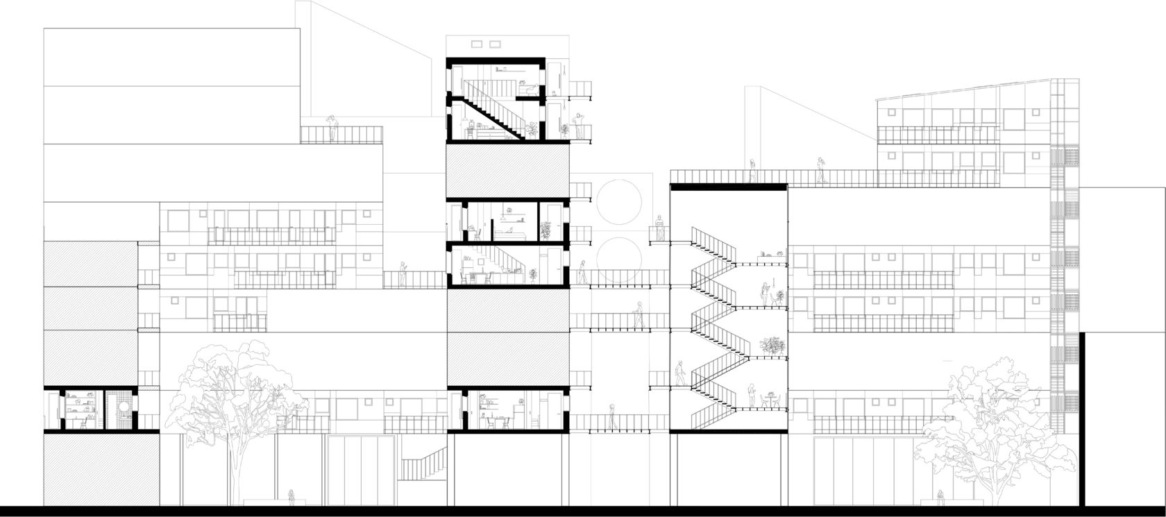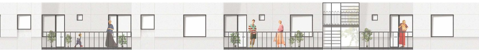 Сквозь стилобат проложен проезд, разделяющий внутренние дворы. В каждом из дворов возникает градиент от общего к частному ― через второстепенные дорожки, изрезанную фасадную линию, арки-проходы. По такому же принципу организовано пространство жилых ячеек. В каждой квартире есть «прострел» между соосными окнами на противоположных стенах, через который квартира просматривается насквозь, а другие помещения наращивают свою степень приватности по мере отдаления от оси.