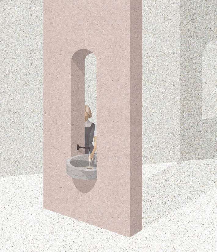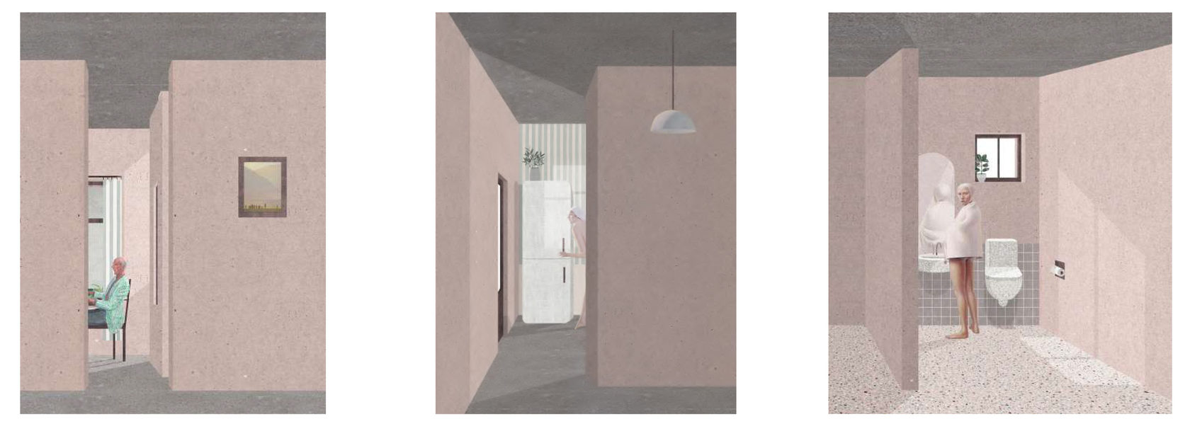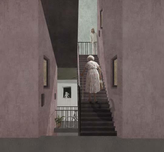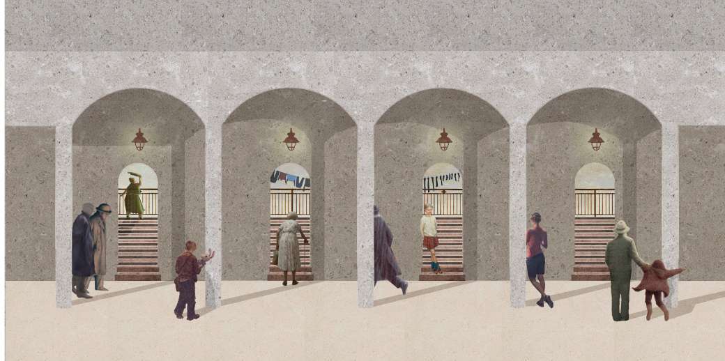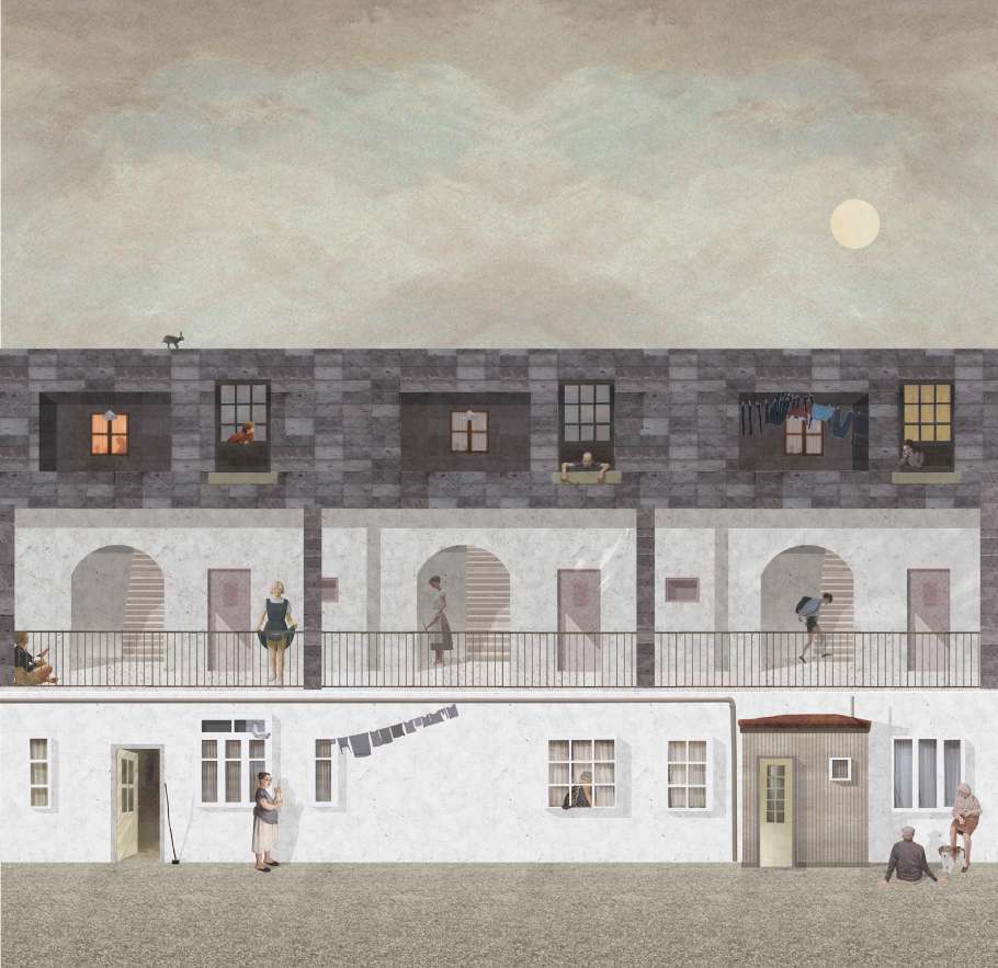 Трёхэтажный дом окружен аркадой, из которой по выступающим из плоскости фасада лестницам можно подняться на общую галерею. В свою очередь, отдельные лестницы ведут с галереи к блокам из двух квартир, образуя на каждом этаже полузакрытое пространство-нишу, используемое двумя соседями. Внутренний двор отдан под общественный огород для жильцов дома. Эти и другие сценарии совместного использования различных пространств разработаны для фасилитации соседского взаимодействия.