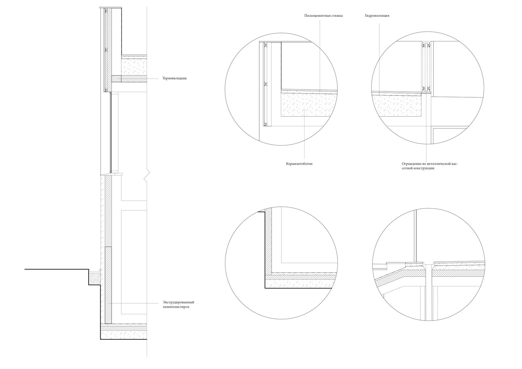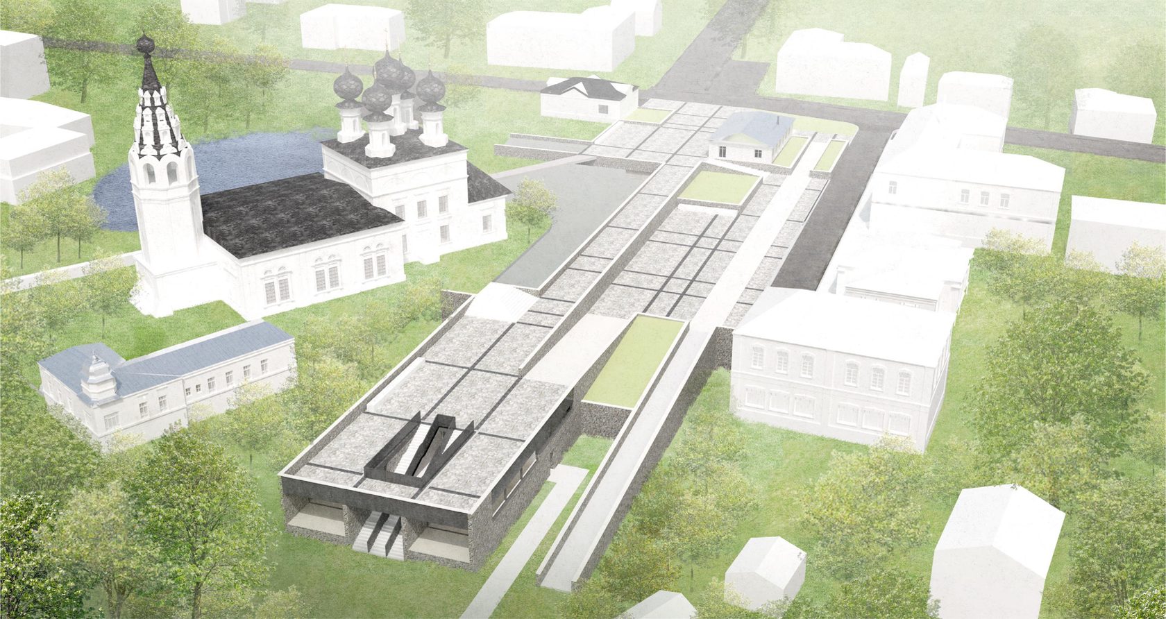 Вместо здания налоговой инспекции, закрывающей обрыв и перспективу на широкую даль, он создаёт единую благоустроенную площадь со спусками и подъемами ― и интегрированным в неё городским кафе. Это сооружение встраивается в ландшафт и получает свой внутренний объем за счет перепада рельефа и заглубления. Торцевые панорамные окна кафе открывают вид на холмы Костромской низменности и то самое болото где-то в глубине лесов.
